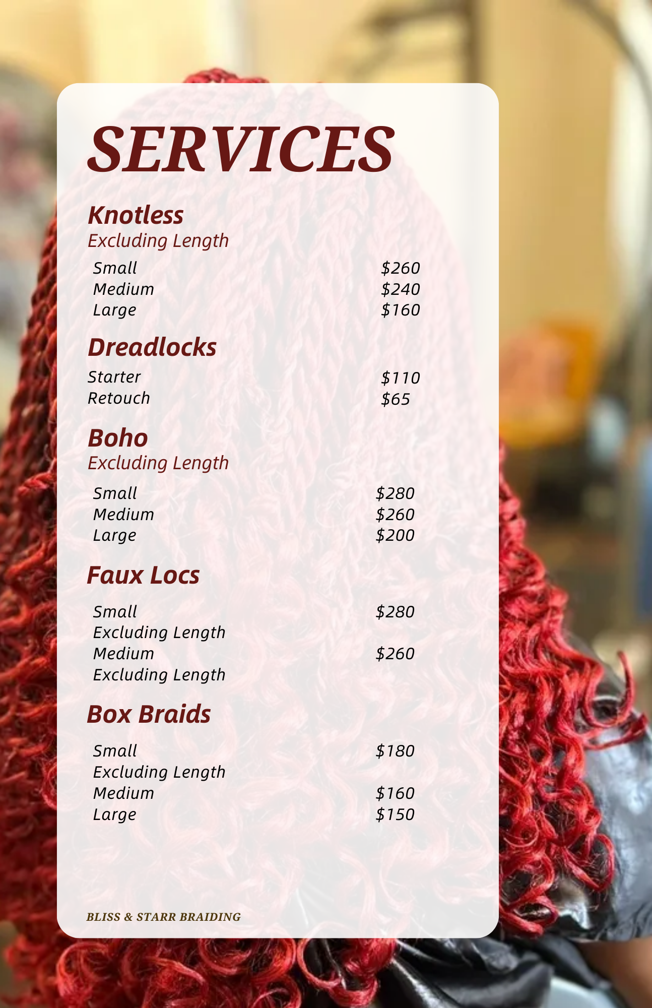 Mon: 9:00 AM - 6:00 PMCopyright © 2025 Bliss Starr Braids & Locs All Rights Reserved. Sitemap. Accessibility Statement